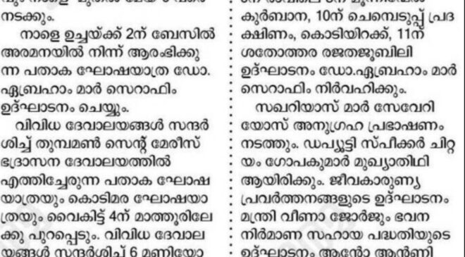 കറവൂർ സെന്റ് ജോർജ് ഓർത്തഡോക്സ് പള്ളിയിൽ 81 മത് ഇടവക പെരുന്നാളും കൺവെൻഷനും മെയ് 3 മുതൽ 9 വരെ അബുദാബി സെന്റ് ജോർജ് ഓർത്തഡോക്സ് കത്തീഡ്രൽ ചരിത്രപ്രസിദ്ധമായ പുത്തൻകാവ് സെന്റ് മേരീസ് ഓർത്തഡോക്സ് കത്തീഡ്രലിൽ കബറടങ്ങിയിരിക്കുന്ന പുണ്യ പിതാക്കന്മാരായ ആറാം മാർത്തോമ്മായുടെ 218-ാം ഓർമ്മയും, എട്ടാം മാർത്തോമ്മായുടെ 210-ാം ഓർമ്മയും, കൂടാതെ കാതോലിക്കേറ്റ് രത്നദീപമായ പുത്തൻകാവിൽ ഗീവർഗീസ് മാർ പീലക്സീനോസ് മെത്രാപ്പോലീത്തായുടെ 75-ാം ഓർമ്മയും സംയുക്തമായി...