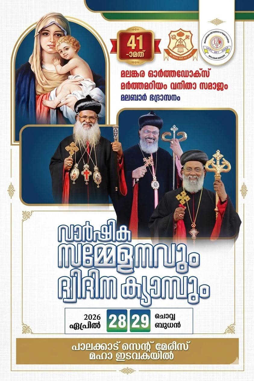മലങ്കര ഓർത്തഡോക്സ് സുറിയാനി സഭവനിതാ സമാജം മലബാർ ഭദ്രാസനംവാർഷിക സമ്മേളനവും ദ്വിദിന ക്യാമ്പും ഏപ്രിൽ 28 29 തീയതികളിൽ പാലക്കാട് സെന്റ് മേരീസ് മഹാ ഇടവകയിൽ വച്ച് നടത്തപ്പെടുന്നു സെന്റ് സ്റ്റീഫൻസ് ഓർത്തഡോക്സ് കത്തീഡ്രൽ കുടശ്ശനാട്, പള്ളി ഭാഗം യുവജനപ്രസ്ഥാനം 5-ാംമത് ജെറിൻ പി ജെയിംസ് മെമ്മോറിയൽ ഇന്റർചർച്ച് ഫുട്ബോൾ ടൂർണ്ണമെന്റ്, മെയ് 2,3 തീയതികളിൽ കോന്നി സെന്റ് ജോർജ് ഓർത്തഡോക്സ് മഹാ ഇടവകയിലെ SDOF പ്രസ്ഥാനത്തിന്റെ ആഭിമുഖ്യത്തിൽ ഇടവകയിലെ 15 വയസ്സിനുശേഷം പ്രായമുള്ള ഇടവക അംഗങ്ങൾക്ക് ആയി ‘ജോർജിയൻ ഭാഗ്യവാൻ’ എന്ന പേരിൽ ഒരു ലക്കിടിപ്പ് പ്രോഗ്രാം നടത്തുവാൻ ആഗ്രഹിക്കുന്നു. ഈ ഞായറാഴ്ച (26/04/2026) വി.കുർബാനയ്ക്കായി ദേവാലയത്തിൽ എത്തുന്നവർ അവരവരുടെ പേരും മേൽവിലാസവും പള്ളിയുടെ പടിഞ്ഞാറ് വശത്ത് ക്രമീകരിക്കുന്ന SDOF കൗണ്ടറിൽ ഏൽപ്പിക്കേണ്ടതാണ്. രാവിലെ 6.30 മണി മുതൽ പേരുകൾ നൽകുവാനുള്ള അവസരം ഉണ്ടാകും.വി. കുർബാനയ്ക്കു…