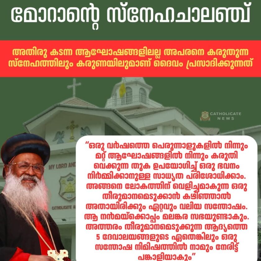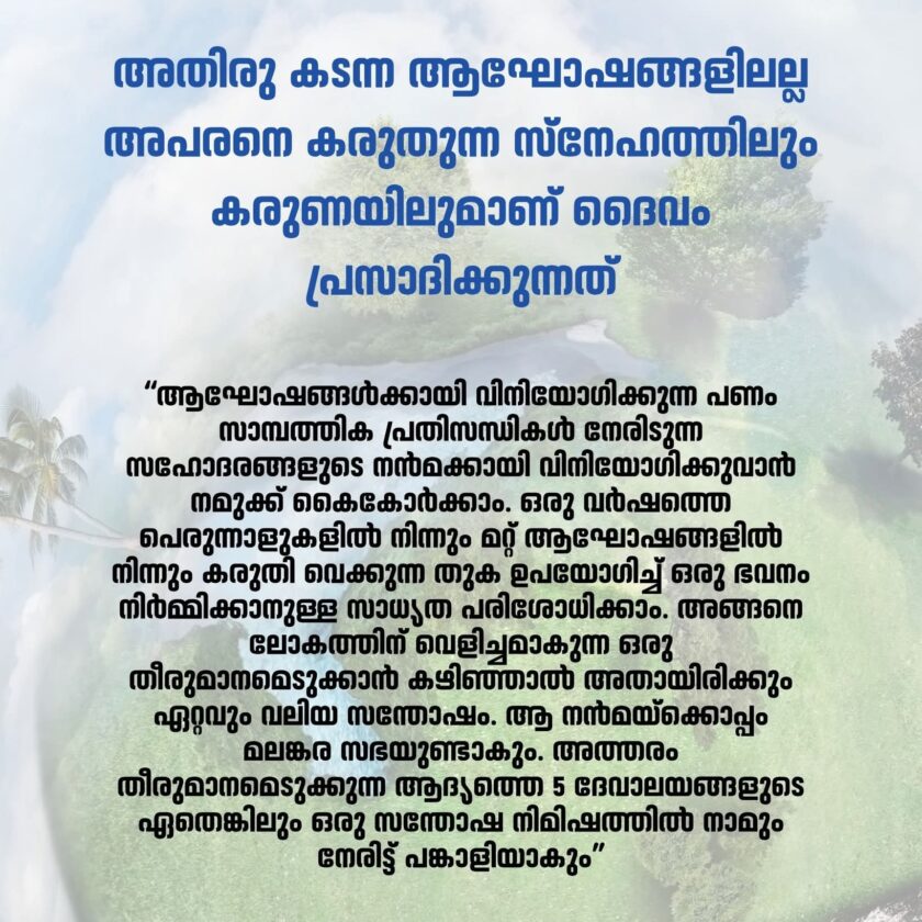 പ്രിയ സഭാ മക്കളെ, ആഘോഷങ്ങൾക്കായി വിനിയോഗിക്കുന്ന പണം സാമ്പത്തിക പ്രതിസന്ധികൾ നേരിടുന്ന സഹോദരങ്ങളുടെ നൻമക്കായി വിനിയോഗിക്കുവാൻ നമുക്ക് കൈകോർക്കാം. ഒരു വർഷത്തെ പെരുന്നാളുകളിൽ നിന്നും മറ്റ് ആഘോഷങ്ങളിൽ നിന്നും കരുതി വെക്കുന്ന തുക ഉപയോഗിച്ച് ഒരു ഭവനം നിർമ്മിക്കാനുള്ള സാധ്യത പരിശോധിക്കാം. അങ്ങനെ ലോകത്തിന് വെളിച്ചമാകുന്ന ഒരു തീരുമാനമെടുക്കാൻ കഴിഞ്ഞാൽ അതായിരിക്കും ഏറ്റവും വലിയ സന്തോഷം. ആ നൻമയ്ക്കൊപ്പം മലങ്കര സഭയുണ്ടാകും. അത്തരം തീരുമാനമെടുക്കുന്ന ആദ്യത്തെ 5 ദേവാലയങ്ങളുടെ ഏതെങ്കിലും ഒരു സന്തോഷ നിമിഷത്തിൽ നാമും നേരിട്ട് പങ്കാളിയാകും.